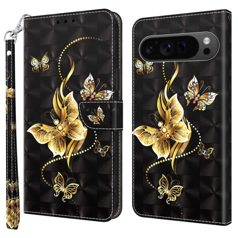 Kotelot Google Pixel 9 Pro Kultaiset Perhoset Hihnalla Suojakuori
